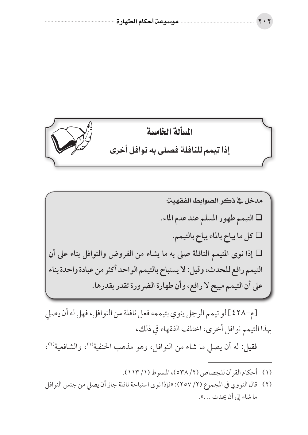 • إذا نوى المتيمم النافلة صلى به ما يشاء من الفروض والنوافل بناء على أن التيمم رافع للحدث، وقيل: لا يستباح بالتيمم الواحد أكثر من عبادة واحدة بناء على أن التيمم مبيح لا رافع، وأن طهارة الضرورة تقدر بقدرها.