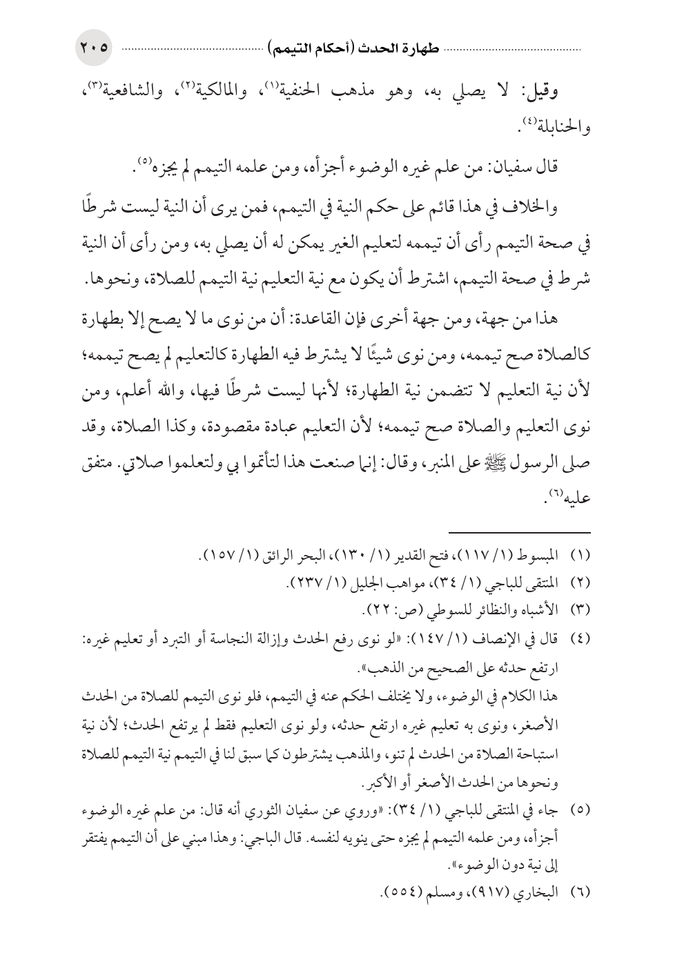 (¬٥) جاء في المنتقى للباجي (١/ ٣٤): «وروي عن سفيان الثوري أنه قال: من علم غيره الوضوء أجزأه، ومن علمه التيمم لم يجزه حتى ينويه لنفسه. قال الباجي: وهذا مبني على أن التيمم يفتقر إلى نية دون الوضوء».