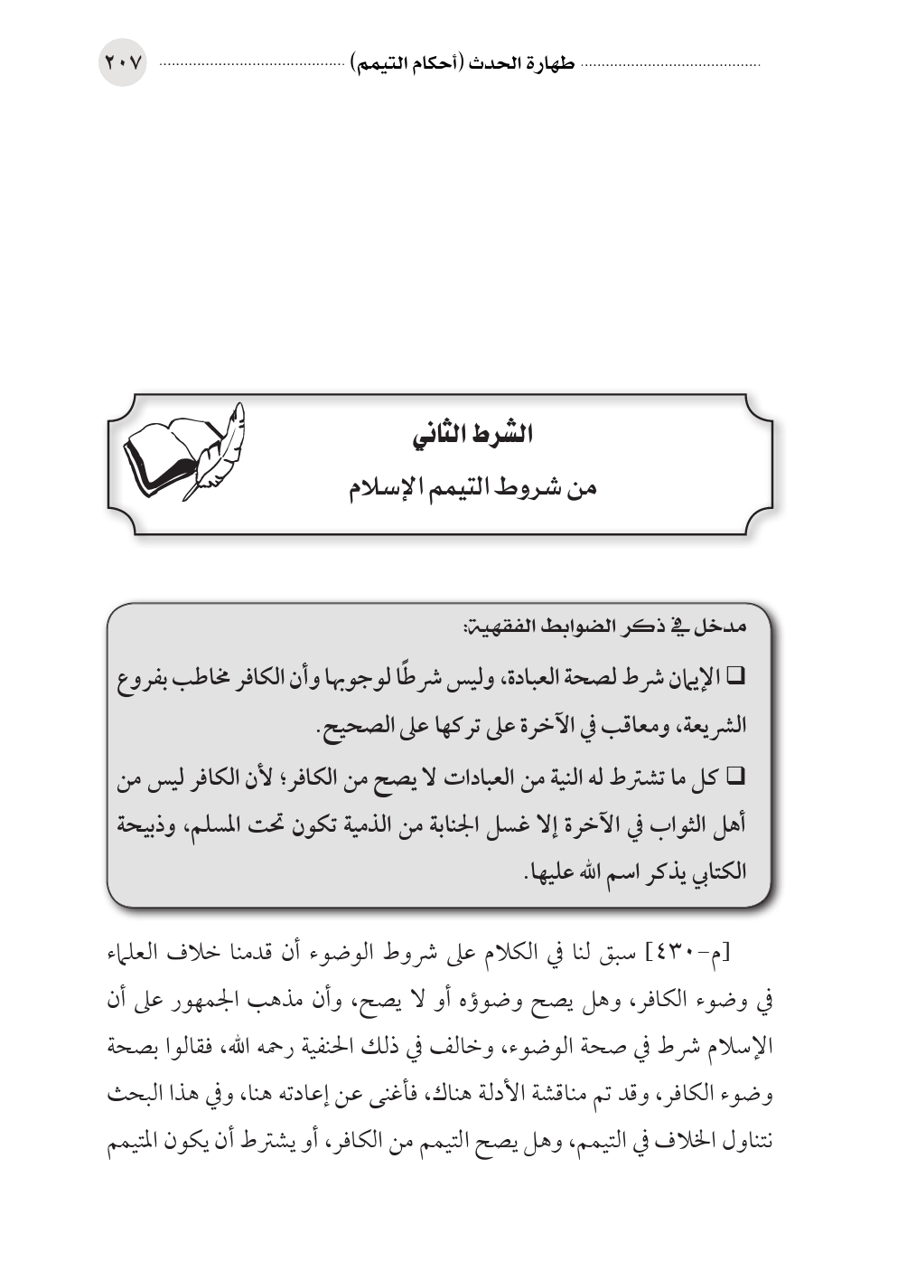 [م-٤٣٠] سبق لنا في الكلام على شروط الوضوء أن قدمنا خلاف العلماء في وضوء الكافر، وهل يصح وضوؤه أو لا يصح، وأن مذهب الجمهور على أن الإسلام شرط في صحة الوضوء، وخالف في ذلك الحنفية رحمه الله، فقالوا بصحة وضوء الكافر، وقد تم مناقشة الأدلة هناك، فأغنى عن إعادته هنا، وفي هذا البحث نتناول الخلاف في التيمم، وهل يصح التيمم من الكافر، أو يشترط أن يكون المتيمم
