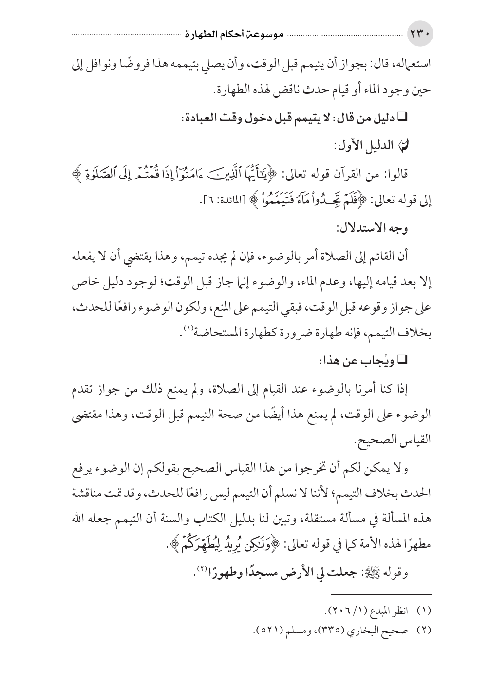 • دليل من قال: لا يتيمم قبل دخول وقت العبادة: