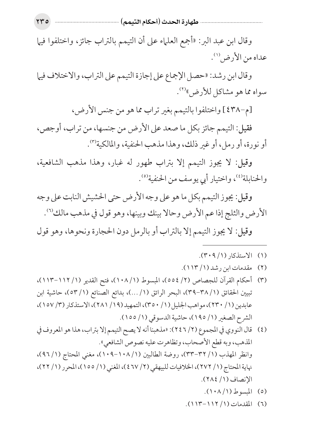(¬٤) قال النووي في المجموع (٢/ ٢٤٦): «مذهبنا أنه لا يصح التيمم إلا بتراب، هذا هو المعروف في المذهب، وبه قطع الأصحاب، وتظاهرت عليه نصوص الشافعي».