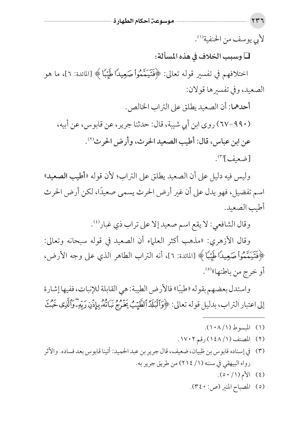 اختلافهم في تفسير قوله تعالى: (فَتَيَمَّمُوا صَعِيداً طَيِّباً) [المائدة: ٦]، ما هو الصعيد، وفي تفسيرها قولان:
