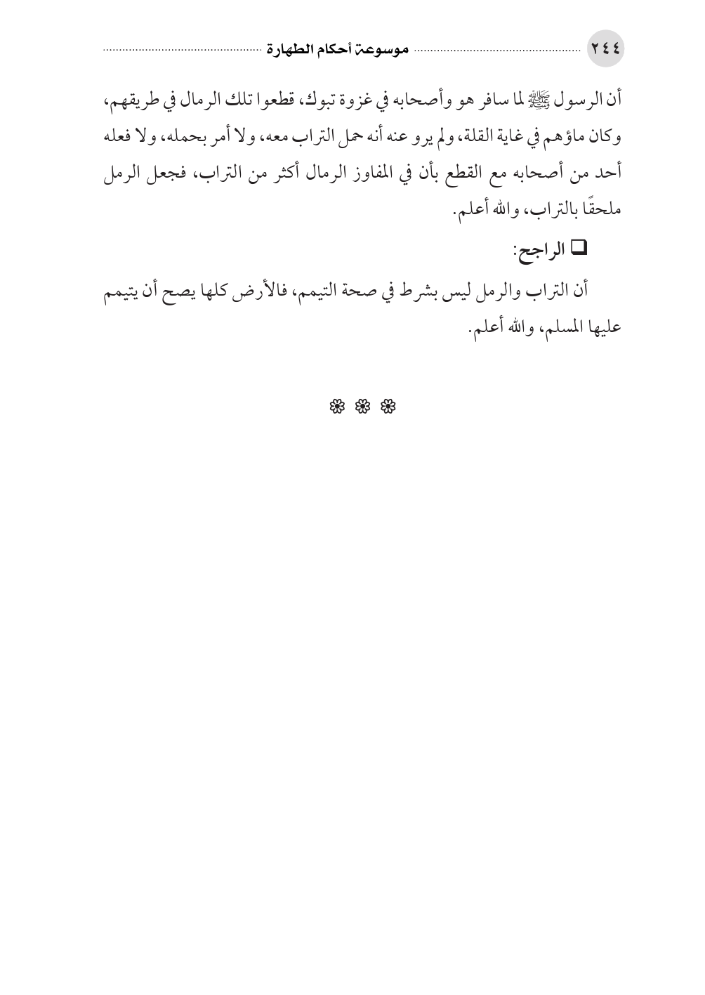 أن الرسول صلى الله عليه وسلم لما سافر هو وأصحابه في غزوة تبوك، قطعوا تلك الرمال في طريقهم، وكان ماؤهم في غاية القلة، ولم يرو عنه أنه حمل التراب معه، ولا أمر بحمله، ولا فعله أحد من أصحابه مع القطع بأن في المفاوز الرمال أكثر من التراب، فجعل الرمل ملحقًا بالتراب، والله أعلم.