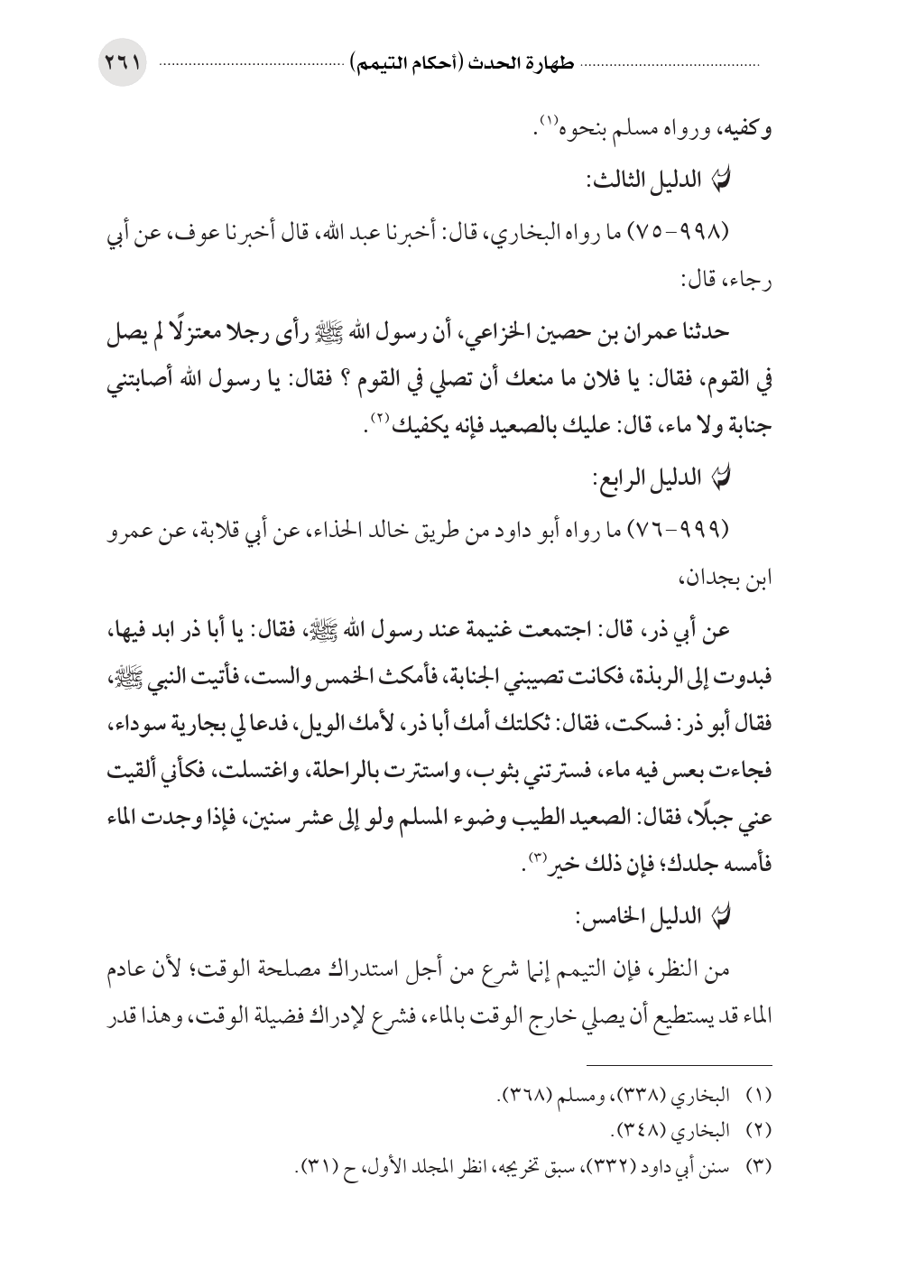 حدثنا عمران بن حصين الخزاعي، أن رسول الله صلى الله عليه وسلم رأى رجلا معتزلًا لم يصل في القوم، فقال: يا فلان ما منعك أن تصلي في القوم؟ فقال: يا رسول الله أصابتني جنابة ولا ماء، قال: عليك بالصعيد فإنه يكفيك (¬٢).