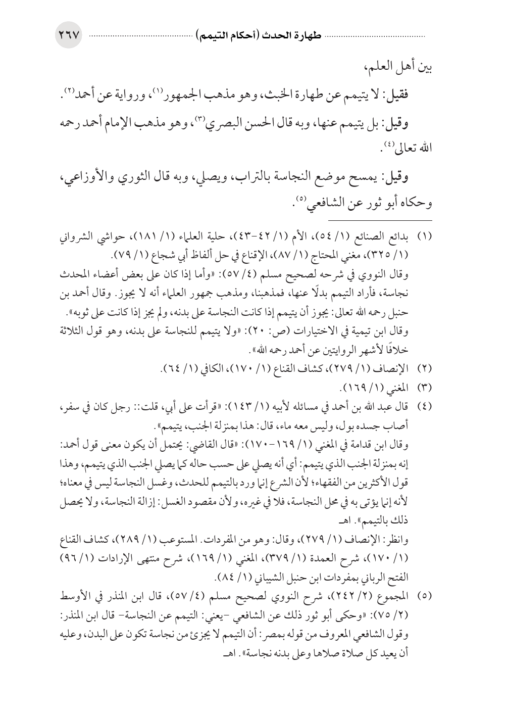 (¬٥) المجموع (٢/ ٢٤٢)، شرح النووي لصحيح مسلم (٤/ ٥٧)، قال ابن المنذر في الأوسط (٢/ ٧٥): «وحكى أبو ثور ذلك عن الشافعي -يعني: التيمم عن النجاسة- قال ابن المنذر: وقول الشافعي المعروف من قوله بمصر: أن التيمم لا يجزئ من نجاسة تكون على البدن، وعليه أن يعيد كل صلاة صلاها وعلى بدنه نجاسة». اهـ
