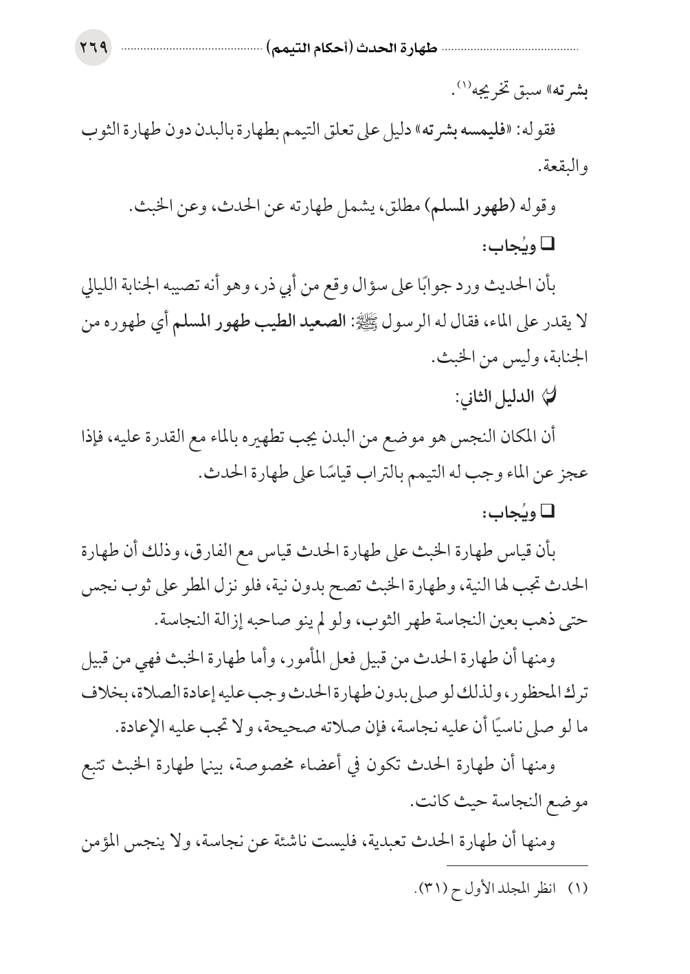 بأن الحديث ورد جوابًا على سؤال وقع من أبي ذر، وهو أنه تصيبه الجنابة الليالي لا يقدر على الماء، فقال له الرسول صلى الله عليه وسلم: الصعيد الطيب طهور المسلم أي طهوره من الجنابة، وليس من الخبث.