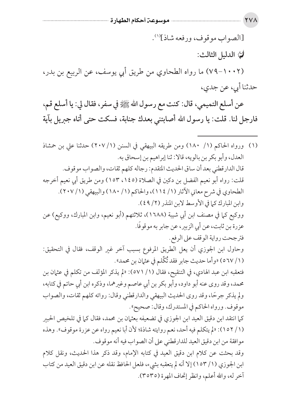 كما انتقد ابن دقيق العيد ابن الجوزي في تضعيفه بعثمان بن محمد، فقال كما في تلخيص الحبير (١/ ١٥٢): «لم يتكلم فيه أحد، نعم روايته شاذة؛ لأن أبا نعيم رواه عن عزرة موقوف». وهذه موافقة من ابن دقيق العيد للدارقطني على أن الصواب فيه أنه موقوف.