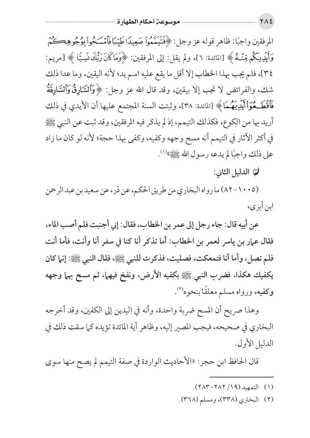 وهذا صريح أن المسح ضربة واحدة، وأنه في اليدين إلى الكفين، وقد أخرجه البخاري في صحيحه، فيجب المصير إليه، وظاهر آية المائدة تؤيده كما سقت ذلك في الدليل الأول.