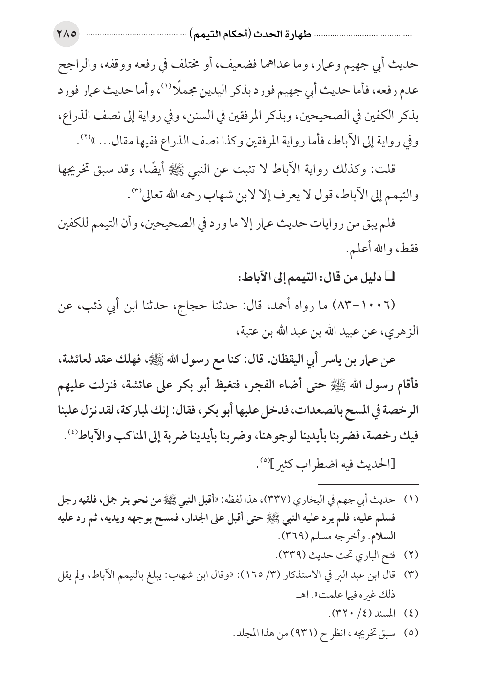 قلت: وكذلك رواية الآباط لا تثبت عن النبي صلى الله عليه وسلم أيضًا، وقد سبق تخريجها والتيمم إلى الآباط، قول لا يعرف إلا لابن شهاب رحمه الله تعالى (¬٣).