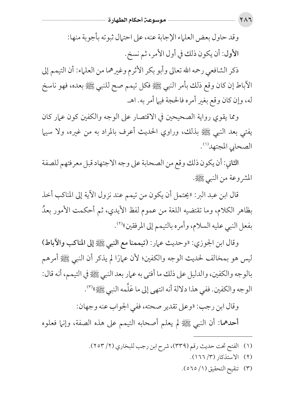 ذكر الشافعي رحمه الله تعالى وأبو بكر الأثرم وغيرهما من العلماء: أن التيمم إلى الآباط إن كان وقع ذلك بأمر النبي صلى الله عليه وسلم فكل تيمم صح للنبي صلى الله عليه وسلم بعده، فهو ناسخ له، وإن كان وقع بغير أمره فالحجة فيما أمر به. اهـ
