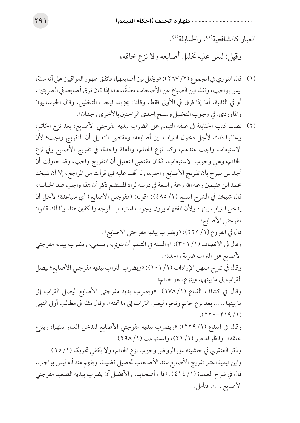 (¬٢) نصت كتب الحنابلة في صفة التيمم على الضرب بيديه مفرجتي الأصابع، بعد نزع الخاتم، وعللوا ذلك لأجل دخول التراب بين أصابعه، ومقتضى التعليل أن التفريج واجب؛ لأن الاستيعاب واجب عندهم، وكذا نزع الخاتم، والعلة واحدة، في تفريج الأصابع وفي نزع الخاتم، وهي وجوب الاستيعاب، فكان مقتضى التعليل أن التفريج واجب، وقد حاولت أن أجد من صرح بأن تفريج الأصابع واجب، ولم أقف عليه فيما قرأت من المراجع، إلا أن شيخنا محمد ابن عثيمين رحمه الله رحمة واسعة في درسه لزاد المستقنع ذكر أن هذا واجب عند الحنابلة،