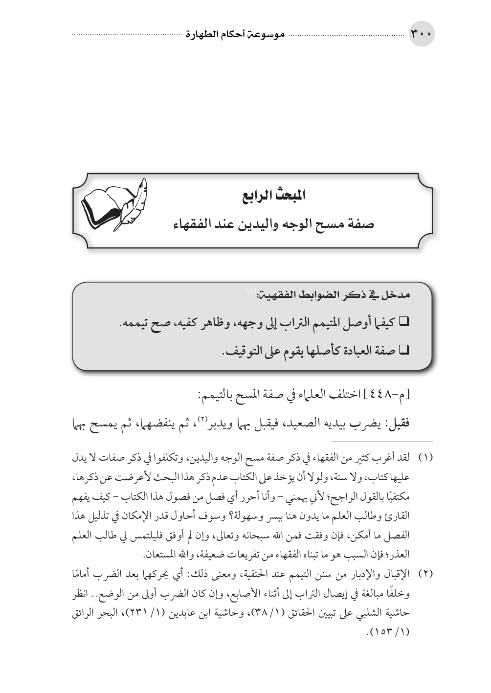 (¬١) لقد أغرب كثير من الفقهاء في ذكر صفة مسح الوجه واليدين، وتكلفوا في ذكر صفات لا يدل عليها كتاب، ولا سنة، ولولا أن يؤخذ على الكتاب عدم ذكر هذا البحث لأعرضت عن ذكرها، مكتفيًا بالقول الراجح؛ لأني يهمني - وأنا أحرر أي فصل من فصول هذا الكتاب - كيف يفهم القارئ وطالب العلم ما يدون هنا بيسر وسهولة؟ وسوف أحاول قدر الإمكان في تذليل هذا الفصل ما أمكن، فإن وفقت فمن الله سبحانه وتعالى، وإن لم أوفق فليلتمس لي طالب العلم العذر؛ فإن السبب هو ما تبناه الفقهاء من تفريعات ضعيفة، والله المستعان.