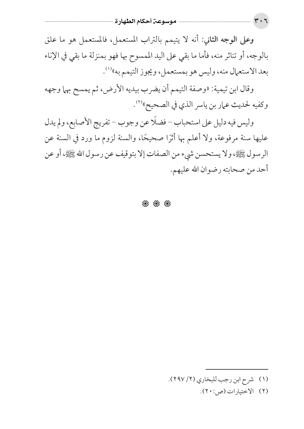 وقال ابن تيمية: «وصفة التيمم أن يضرب بيديه الأرض، ثم يمسح بهما وجهه وكفيه لحديث عمار بن ياسر الذي في الصحيح» (¬٢).