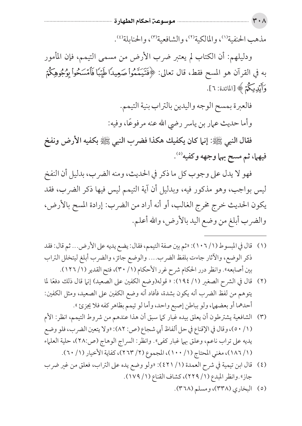(¬٣) الشافعية يشترطون أن يعلق بيده غبار كما سبق أن هذا عندهم من شروط التيمم، انظر: الأم (١/ ٥٠)، وقال في الإقناع في حل ألفاظ أبي شجاع (ص: ٨٢): «ولا يتعين الضرب، فلو وضع يديه على تراب ناعم، وعلق بهما غبار كفى». وانظر: السراج الوهاج (ص: ٢٨)، حلية العلماء (١/ ١٨٦)، مغني المحتاج (١/ ١٠٠)، المجموع (٢/ ٢٦٣)، كفاية الأخيار (١/ ٦٠).