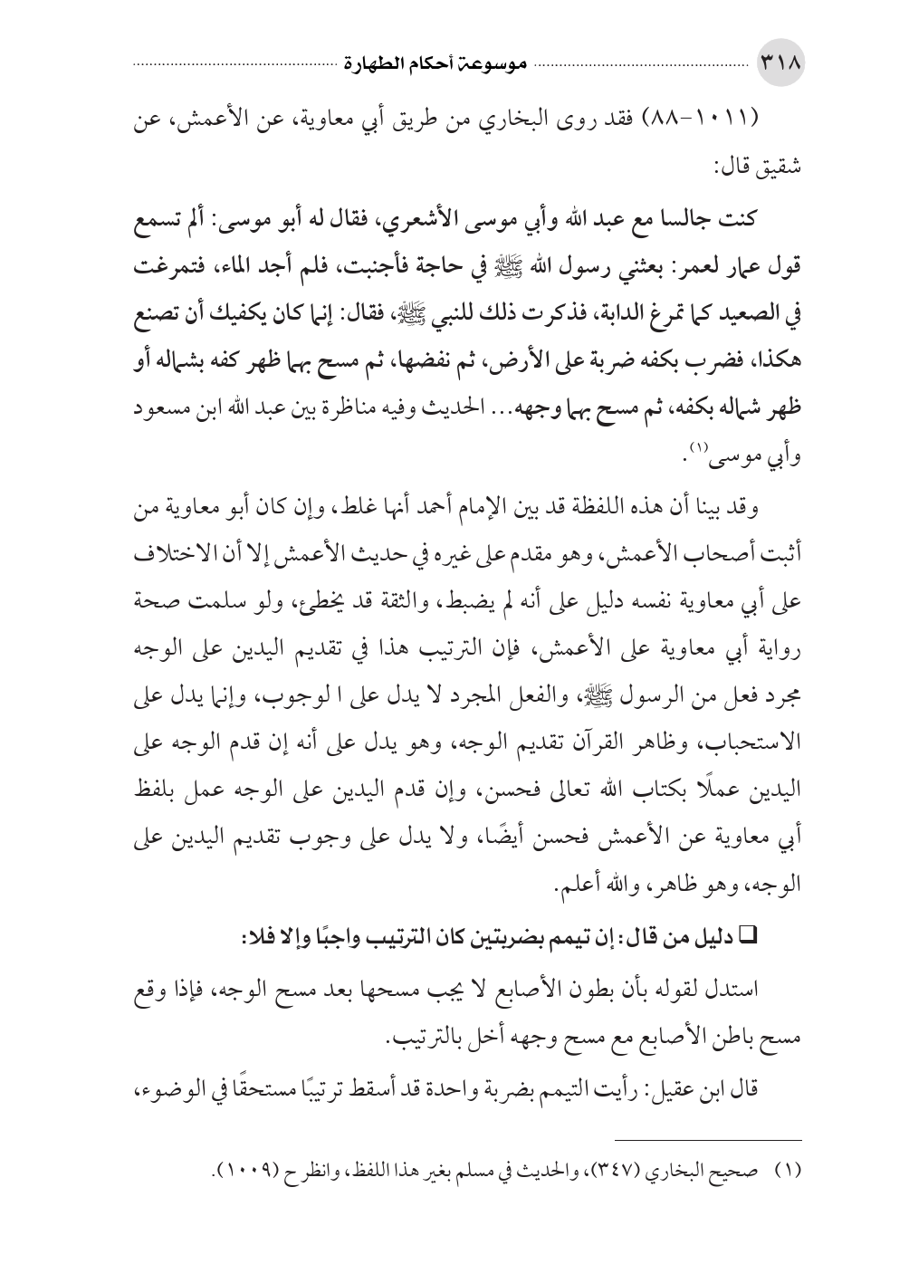 وقد بينا أن هذه اللفظة قد بين الإمام أحمد أنها غلط، وإن كان أبو معاوية من أثبت أصحاب الأعمش، وهو مقدم على غيره في حديث الأعمش إلا أن الاختلاف على أبي معاوية نفسه دليل على أنه لم يضبط، والثقة قد يخطئ، ولو سلمت صحة رواية أبي معاوية على الأعمش، فإن الترتيب هذا في تقديم اليدين على الوجه مجرد فعل من الرسول صلى الله عليه وسلم، والفعل المجرد لا يدل على الوجوب، وإنما يدل على الاستحباب، وظاهر القرآن تقديم الوجه، وهو يدل على أنه إن قدم الوجه على اليدين عملًا بكتاب الله تعالى فحسن، وإن قدم اليدين على الوجه عمل بلفظ