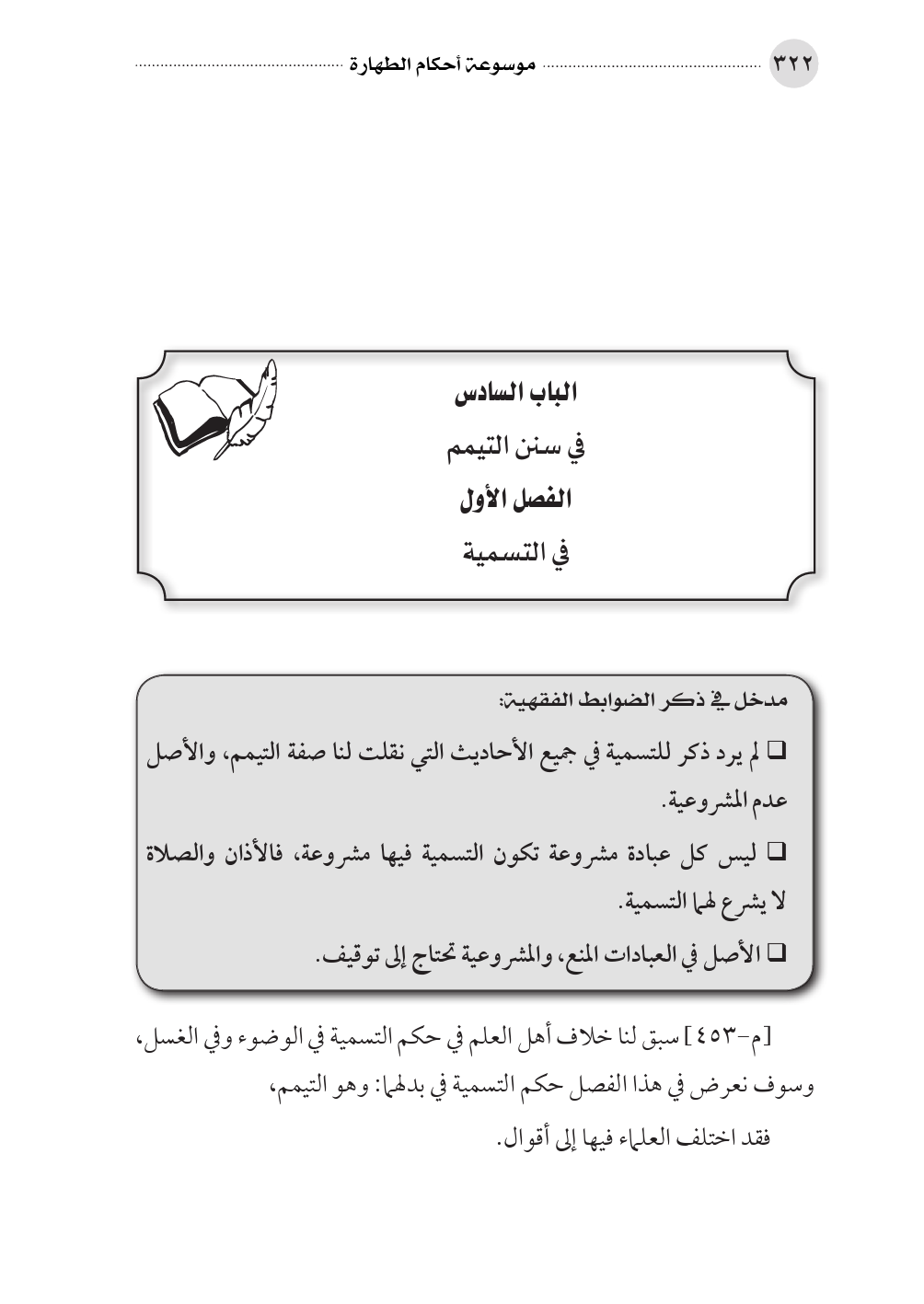 [م-٤٥٣] سبق لنا خلاف أهل العلم في حكم التسمية في الوضوء وفي الغسل، وسوف نعرض في هذا الفصل حكم التسمية في بدلهما: وهو التيمم،