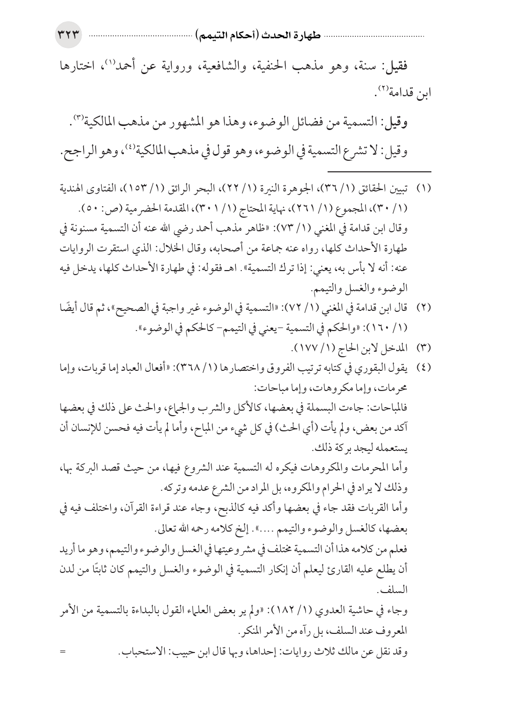 فعلم من كلامه هذا أن التسمية مختلف في مشروعيتها في الغسل والوضوء والتيمم، وهو ما أريد أن يطلع عليه القارئ ليعلم أن إنكار التسمية في الوضوء والغسل والتيمم كان ثابتًا من لدن السلف.