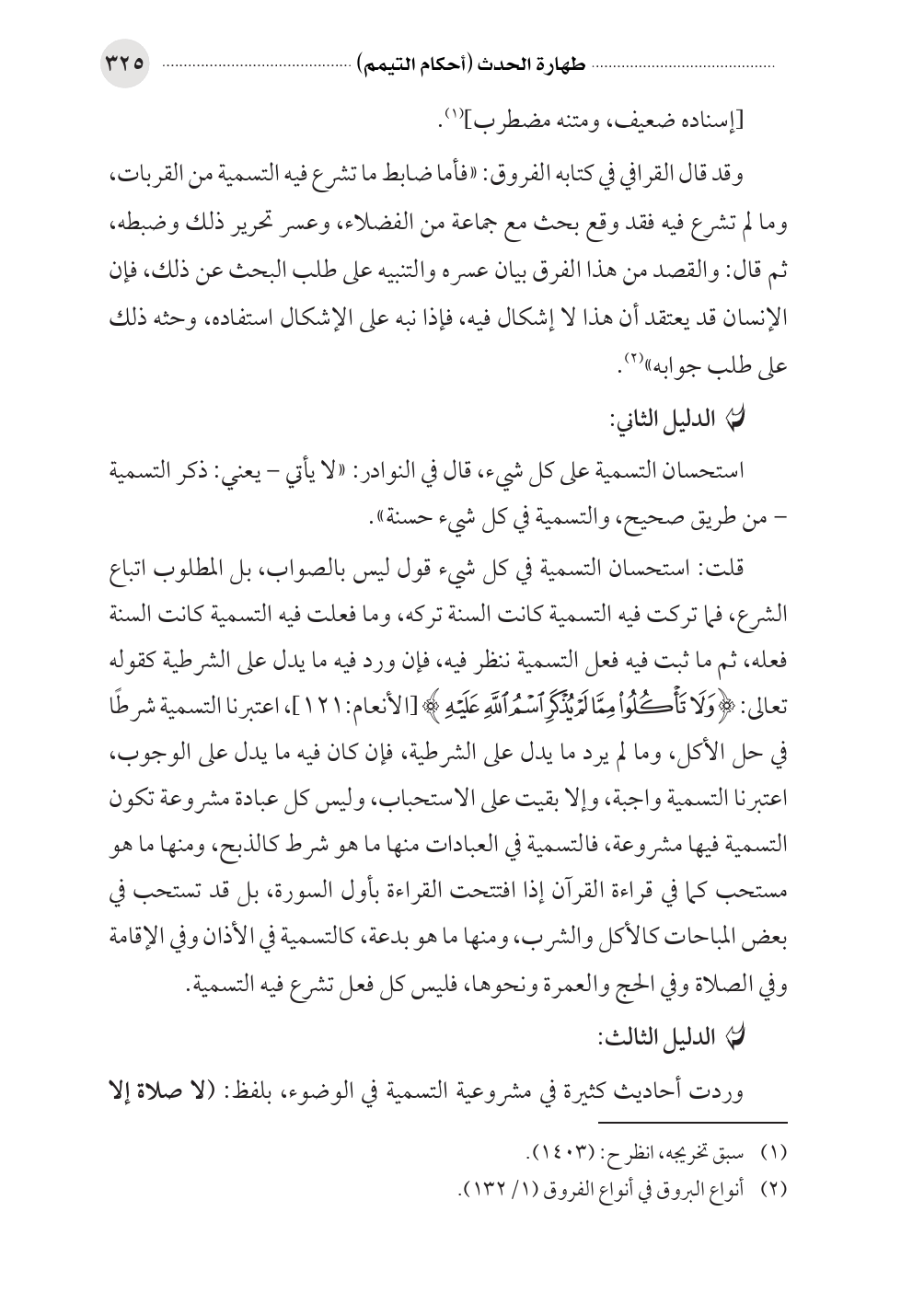 وقد قال القرافي في كتابه الفروق: «فأما ضابط ما تشرع فيه التسمية من القربات، وما لم تشرع فيه فقد وقع بحث مع جماعة من الفضلاء، وعسر تحرير ذلك وضبطه، ثم قال: والقصد من هذا الفرق بيان عسره والتنبيه على طلب البحث عن ذلك، فإن الإنسان قد يعتقد أن هذا لا إشكال فيه، فإذا نبه على الإشكال استفاده، وحثه ذلك على طلب جوابه» (¬٢).