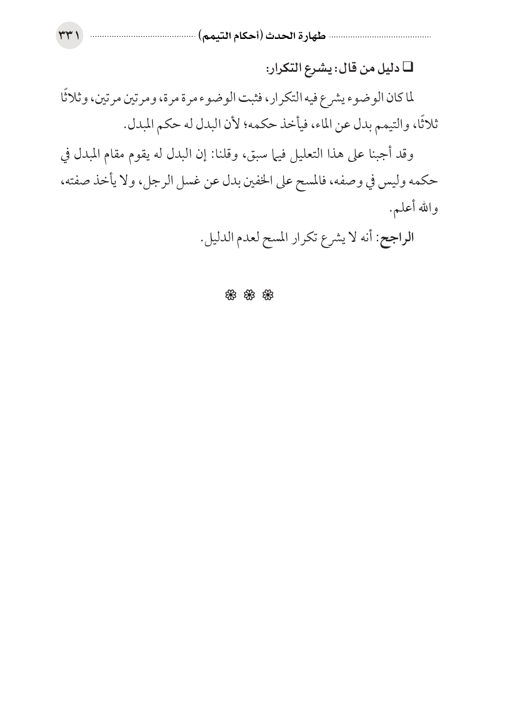 وقد أجبنا على هذا التعليل فيما سبق، وقلنا: إن البدل له يقوم مقام المبدل في حكمه وليس في وصفه، فالمسح على الخفين بدل عن غسل الرجل، ولا يأخذ صفته، والله أعلم.