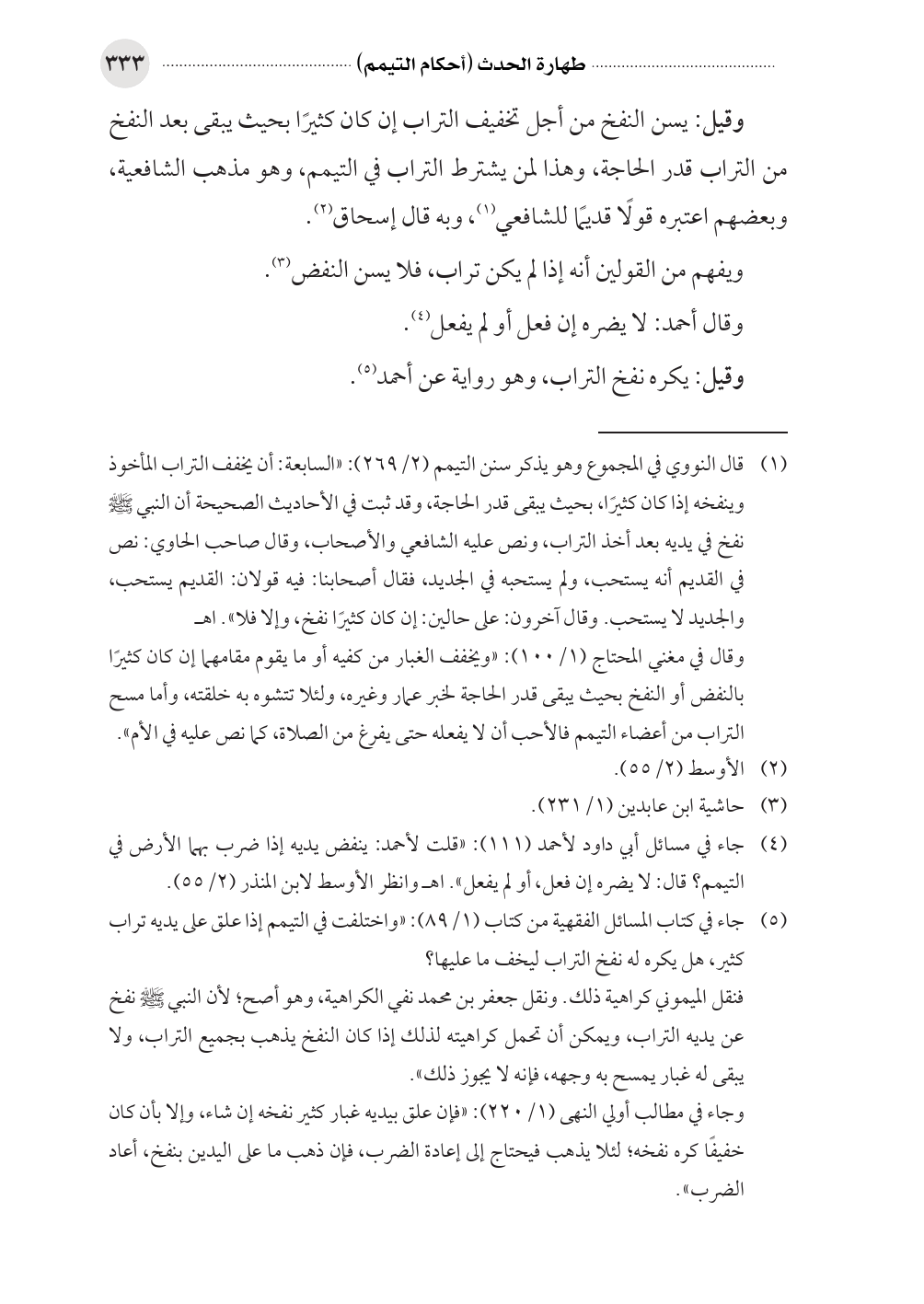 (¬١) قال النووي في المجموع وهو يذكر سنن التيمم (٢/ ٢٦٩): «السابعة: أن يخفف التراب المأخوذ وينفخه إذا كان كثيرًا، بحيث يبقى قدر الحاجة، وقد ثبت في الأحاديث الصحيحة أن النبي صلى الله عليه وسلم نفخ في يديه بعد أخذ التراب، ونص عليه الشافعي والأصحاب، وقال صاحب الحاوي: نص في القديم أنه يستحب، ولم يستحبه في الجديد، فقال أصحابنا: فيه قولان: القديم يستحب، والجديد لا يستحب. وقال آخرون: على حالين: إن كان كثيرًا نفخ، وإلا فلا». اهـ