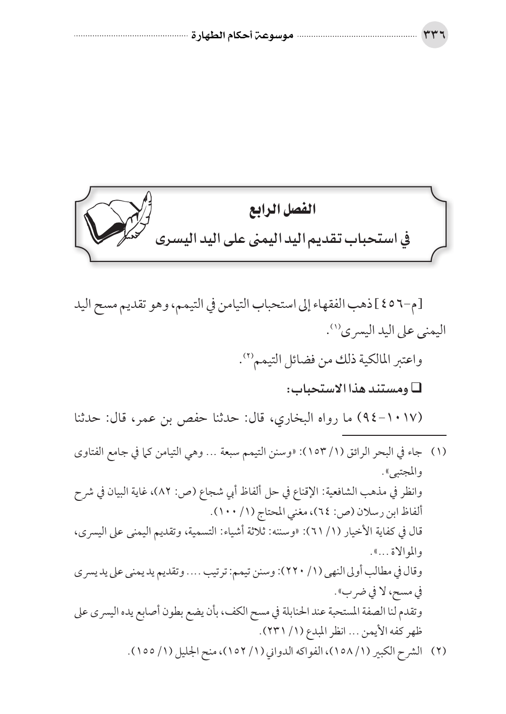 (¬١) جاء في البحر الرائق (١/ ١٥٣): «وسنن التيمم سبعة ... وهي التيامن كما في جامع الفتاوى والمجتبى».