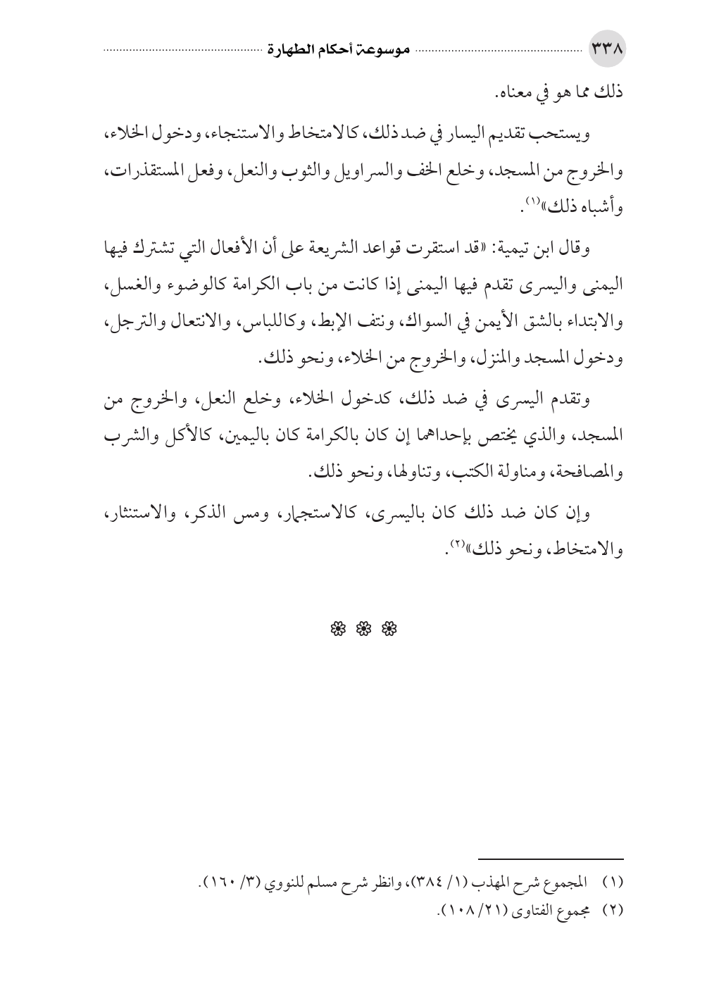 ويستحب تقديم اليسار في ضد ذلك، كالامتخاط والاستنجاء، ودخول الخلاء، والخروج من المسجد، وخلع الخف والسراويل والثوب والنعل، وفعل المستقذرات، وأشباه ذلك» (¬١).