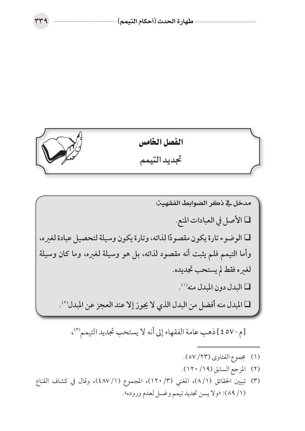 (¬٣) تبيين الحقائق (١/ ٨)، المغني (٣/ ١٢٠)، المجموع (١/ ٤٨٧)، وقال في كشاف القناع (١/ ٨٩): «ولا يسن تجديد تيمم وغسل لعدم وروده».