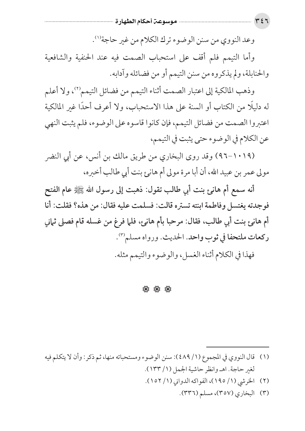 (¬١) قال النووي في المجموع (١/ ٤٨٩): سنن الوضوء ومستحباته منها، ثم ذكر: وأن لا يتكلم فيه لغير حاجة. اهـ وانظر حاشية الجمل (١/ ١٣٣).