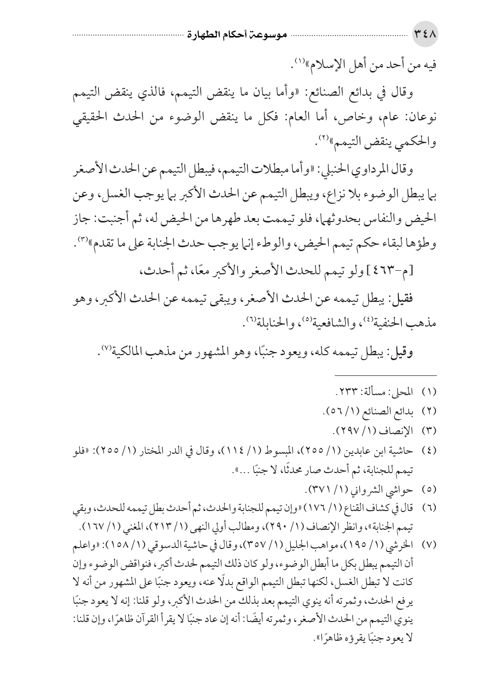 وقال المرداوي الحنبلي: «وأما مبطلات التيمم، فيبطل التيمم عن الحدث الأصغر بما يبطل الوضوء بلا نزاع، ويبطل التيمم عن الحدث الأكبر بما يوجب الغسل، وعن الحيض والنفاس بحدوثهما، فلو تيممت بعد طهرها من الحيض له، ثم أجنبت: جاز وطؤها لبقاء حكم تيمم الحيض، والوطء إنما يوجب حدث الجنابة على ما تقدم» (¬٣).