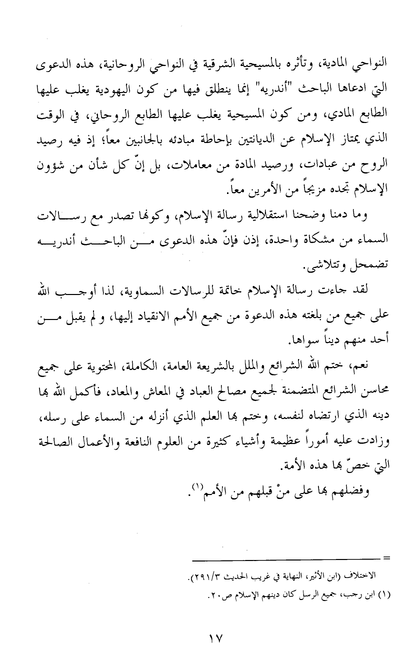 النواحي المادية، وتأثره بالمسيحية الشرقية في النواحي الروحانية، هذه الدعوى التي ادعاها الباحث "أندريه" إنما ينطلق فيها من كون اليهودية يغلب عليها الطابع المادي، ومن كون المسيحية يغلب عليها الطابع الروحاني، في الوقت الذي يمتاز الإسلام عن الديانتين بإحاطة مبادئه بالجانبين معاً؛ إذ فيه رصيد الروح من عبادات، ورصيد المادة من معاملات، بل إنّ كل شأن من شؤون الإسلام تجده مزيجاً من الأمرين معاً.