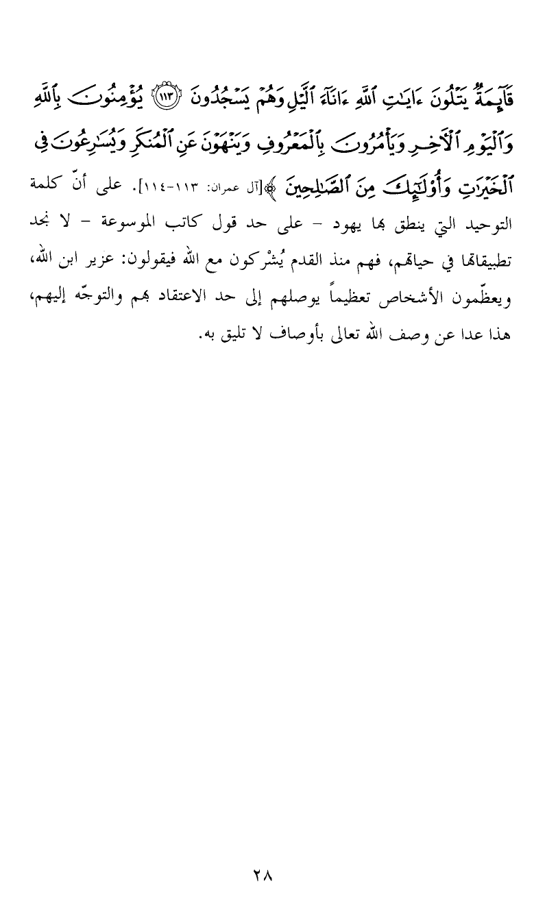 قَآئِمَةٌ يَتْلُونَ آيَاتِ اللهِ آنَاء اللَّيْلِ وَهُمْ يَسْجُدُونَ، يُؤْمِنُونَ بِاللهِ وَالْيَوْمِ الآخِرِ وَيَأْمُرُونَ بِالْمَعْرُوفِ وَيَنْهَوْنَ عَنِ الْمُنكَرِ وَيُسَارِعُونَ فِي الْخَيْرَاتِ وَأُوْلَئِكَ مِنَ الصَّالِحِينَ} [آل عمران:113 -114] . على أنّ كلمة التوحيد التي ينطق بها يهود - على حد قول كاتب الموسوعة - لا نجد تطبيقاتها في حياتهم، فهم منذ القدم يُشْركون مع الله فيقولون: عزير ابن الله، ويعظّمون الأشخاص تعظيماً يوصلهم إلى حد الاعتقاد بهم والتوجّه إليهم، هذا عدا عن وصف الله تعالى بأوصاف لا تليق به.
