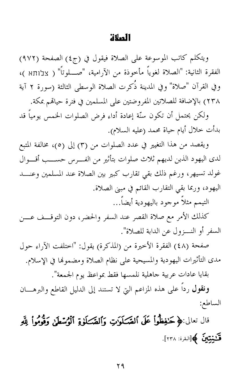 ويتكلم كاتب الموسوعة على الصلاة فيقول في (ج4) الصفحة (972) الفقرة الثانية: "الصلاة لغوياً مأخوذة من الآرامية، "صلوتاً" (.....) ، وفي القرآن "صلاة" وفي المدينة ذُكرت الصلاة الوسطى الثالثة (سورة 2 آية 238) بالإضافة للصلاتين المفروضتين على المسلمين في فترة حياتهم بمكة.