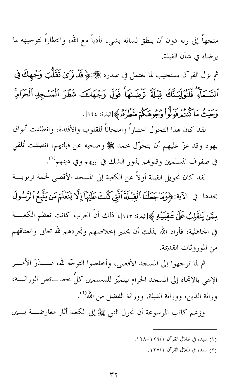 ثم لما توجهوا إلى المسجد الأقصى، وأخلصوا التوجّه لله، صدَرَ الأمر الإلهي بالاتجاه إلى المسجد الحرام ليتميّز للمسلمين كلُّ خصائص الوراثة، وراثة الدين، ووراثة القبلة، ووراثة الفضل من الله (2) .