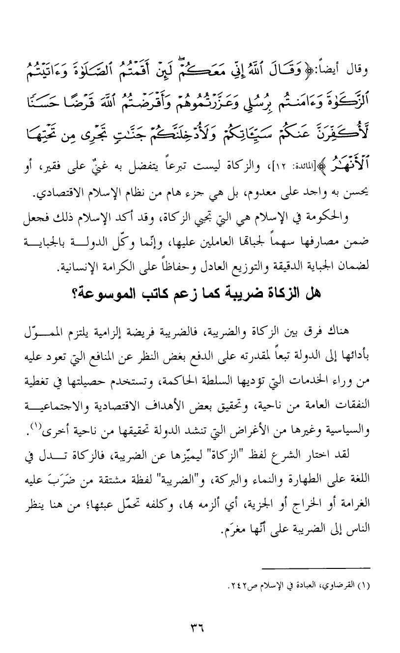 وقال أيضاً: {وَقَالَ اللهُ إِنِّي مَعَكُمْ لَئِنْ أَقَمْتُمُ الصَّلاَةَ وَآتَيْتُمُ الزَّكَاةَ وَآمَنتُم بِرُسُلِي وَعَزَّرْتُمُوهُمْ وَأَقْرَضْتُمُ اللهَ قَرْضًا حَسَنًا لَّأُكَفِّرَنَّ عَنكُمْ سَيِّئَاتِكُمْ وَلأُدْخِلَنَّكُمْ جَنَّاتٍ تَجْرِي مِن تَحْتِهَا الأَنْهَارُ} [المائدة:12] ، والزكاة ليست تبرعاً يتفضل به غنيٌ على فقير، أو يحسن به واجد على معدوم، بل هي جزء هام من نظام الإسلام الاقتصادي.