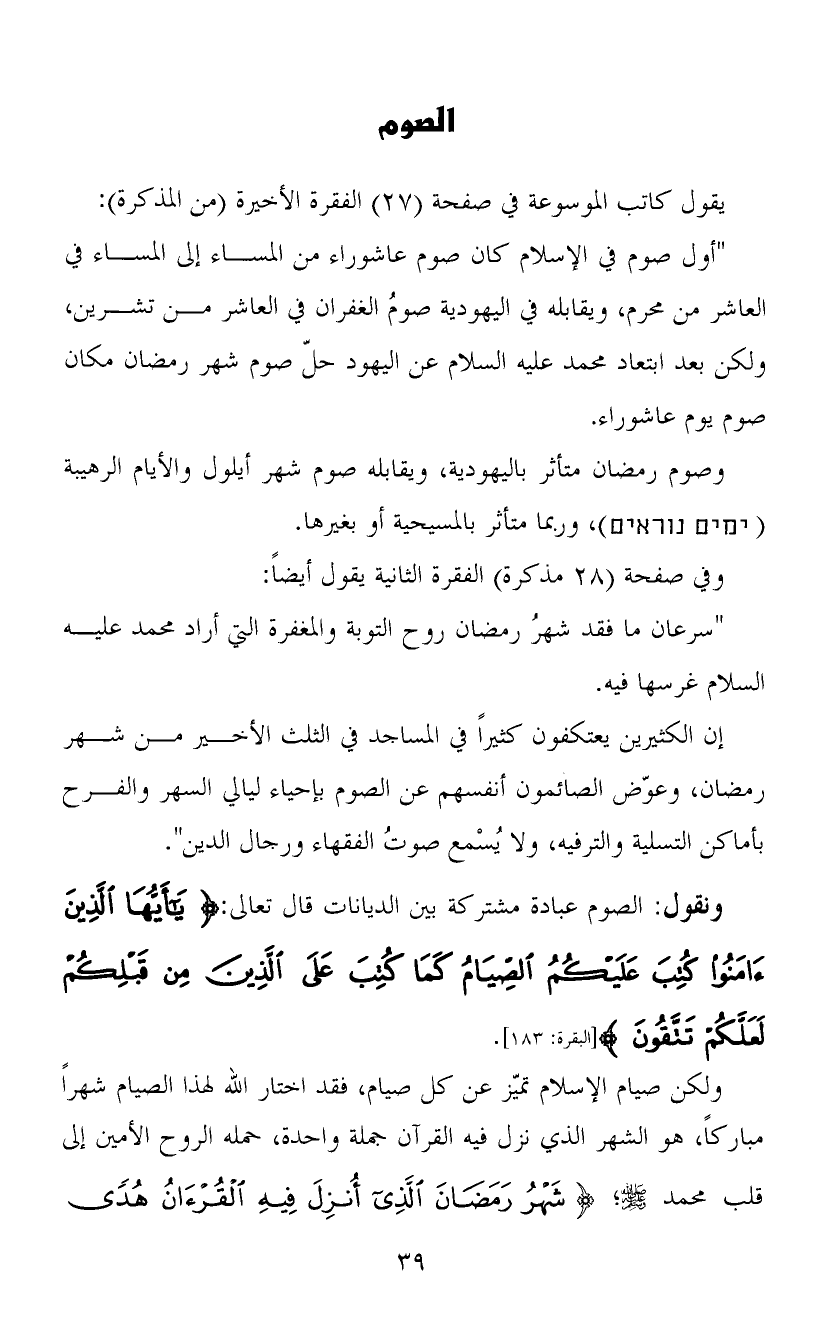 ونقول: الصوم عبادة مشتركة بين الديانات قال تعالى: {يَا أَيُّهَا الَّذِينَ آمَنُواْ كُتِبَ عَلَيْكُمُ الصِّيَامُ كَمَا كُتِبَ عَلَى الَّذِينَ مِن قَبْلِكُمْ لَعَلَّكُمْ تَتَّقُونَ} [البقرة:183] .