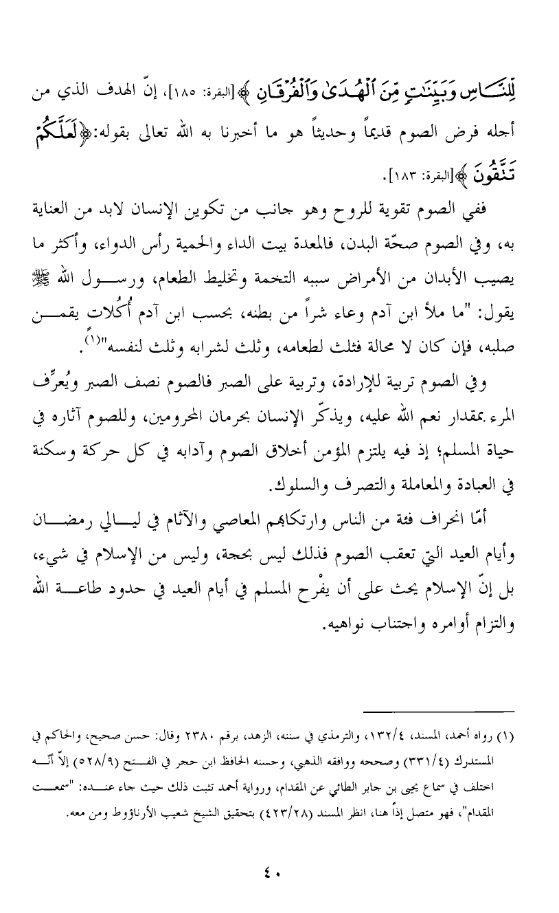 (1) رواه أحمد، المسند، 4/132، والترمذي في سننه، الزهد، برقم 2380 وقال: حسن صحيح، والحاكم في المستدرك (4/331) وصححه ووافقه الذهبي، وحسنه الحافظ ابن حجر في الفتح (9/528) إلاّ أنّه اختلف في سماع يحيى بن جابر الطائي عن المقدام، ورواية أحمد تثبت ذلك حيث جاء عنده: "سمعت المقدام"، فهو متصل إذاً هنا، انظر المسند (28/423) بتحقيق الشيخ شعيب الأرناؤوط ومن معه.