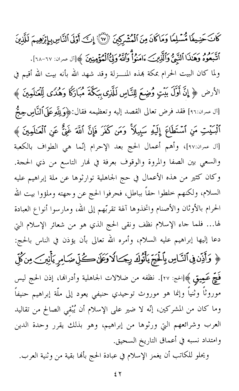 ولما كان البيت الحرام بمكة بهذه المنزلة وقد شهد الله بأنه بيت الله أقيم في الأرض {إِنَّ أَوَّلَ بَيْتٍ وُضِعَ لِلنَّاسِ لَلَّذِي بِبَكَّةَ مُبَارَكًا وَهُدًى لِّلْعَالَمِينَ} [آل عمران:96] فقد فرض تعالى القصد إليه وتعظيمه فقال: {وَلِلّهِ عَلَى النَّاسِ حِجُّ الْبَيْتِ مَنِ اسْتَطَاعَ إِلَيْهِ سَبِيلاً وَمَن كَفَرَ فَإِنَّ الله غَنِيٌّ عَنِ الْعَالَمِينَ} [آل عمران:97] ، وأهم أعمال الحج بعد الإحرام إنّما هي الطواف بالكعبة والسعي بين الصفا والمروة والوقوف بعرفة في نهار التاسع من ذي الحجة. وكان كثير من هذه الأعمال في حج الجاهلية توارثوها عن ملة إبراهيم عليه السلام، ولكنهم خلطوا حقاً بباطل، فحرفوا الحج عن وجهته وملؤوا بيت الله الحرام بالأوثان والأصنام واتخذوها آلهة تقربّهم إلى الله، ومارسوا أنواع العبادة لها ... فلما جاء الإسلام نظف ونقى الحج الذي هو من شعائر الإسلام التي دعا إليها إبراهيم عليه السلام، وأمره الله تعالى بأن يؤذن في الناس بالحج: {وَأَذِّن فِي النَّاسِ بِالْحَجِّ يَأْتُوكَ رِجَالًا وَعَلَى كُلِّ ضَامِرٍ يَأْتِينَ مِن كُلِّ فَجٍّ عَمِيقٍ} [الحج:27] . نظفه من ضلالات الجاهلية وأدرانها، إذن الحج ليس موروثاً وثنياً وإنما هو موروث توحيدي حنيفي يعود إلى ملّة إبراهيم حنيفاً وما كان من المشركين، إنّه لا ضير على الإسلام أن يُبْقِي الصالح من تقاليد العرب وشرائعهم التي ورثوها من إبراهيم، وهو بذلك يقرر وحدة الدين وامتداد نسبه في أعماق التاريخ السحيق.