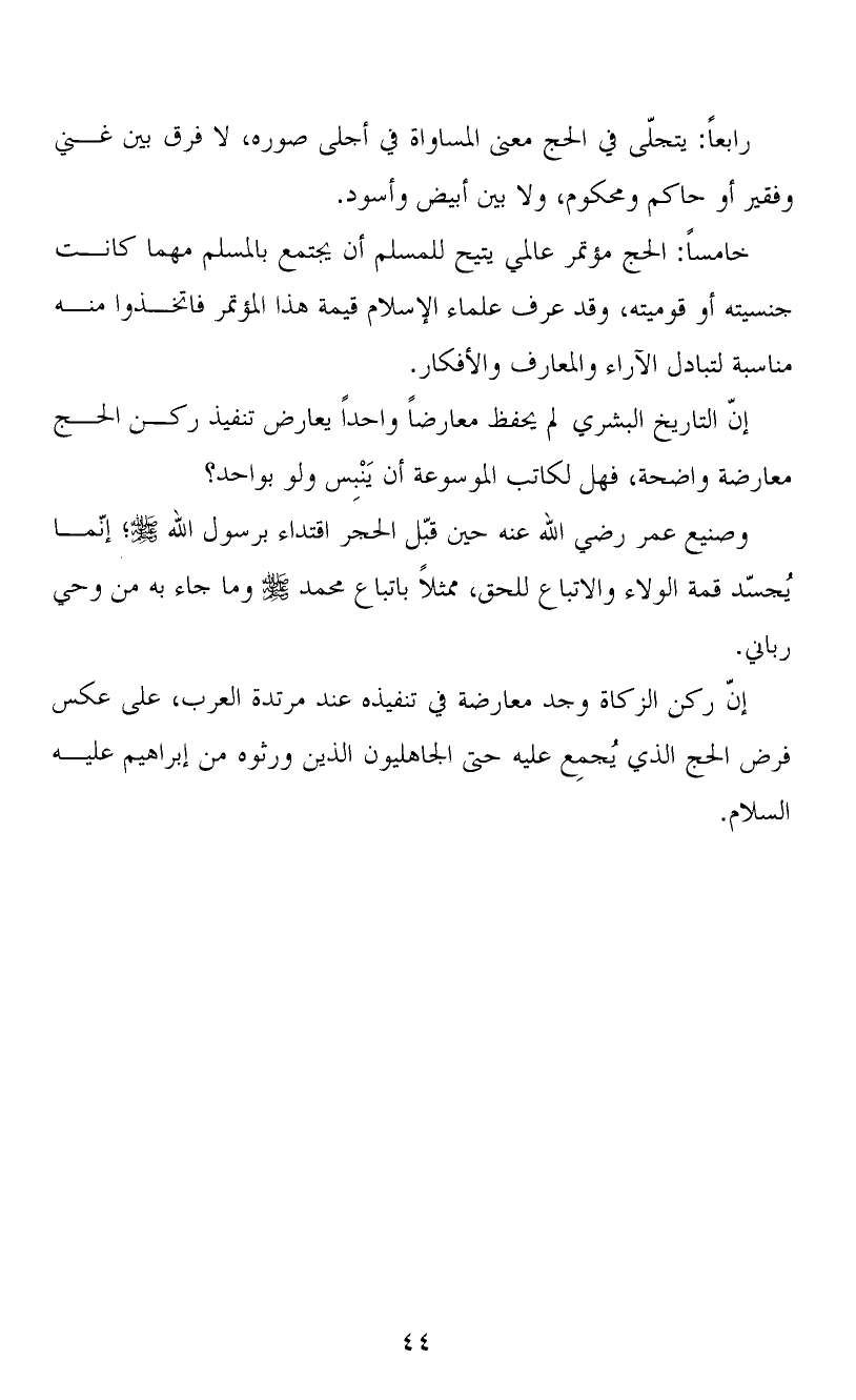 رابعاً: يتجلّى في الحج معنى المساواة في أجلى صوره، لا فرق بين غني وفقير أو حاكم ومحكوم، ولا بين أبيض وأسود.