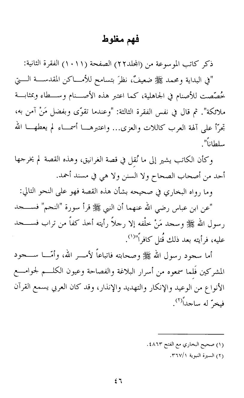 وكأن الكاتب يشير إلى ما نُقِل في قصة الغرانيق، وهذه القصة لم يخرجها أحد من أصحاب الصحاح ولا السنن ولا هي في مسند أحمد.