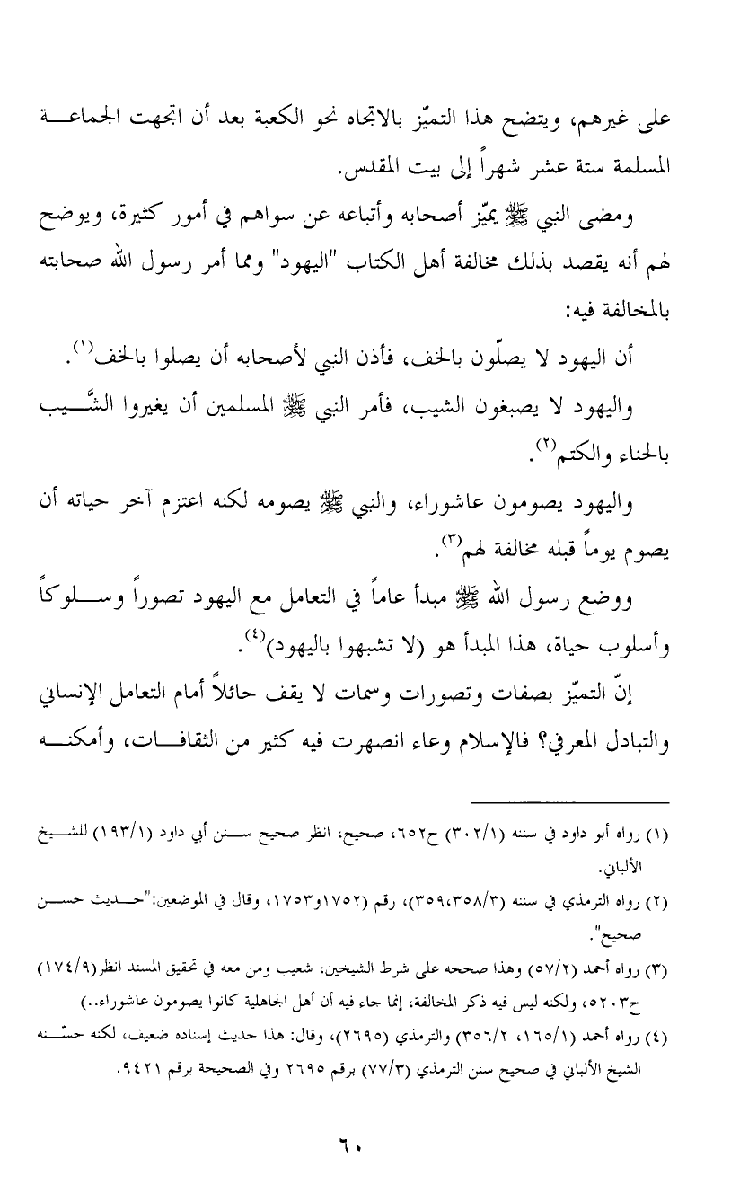 ومضى النبي صلى الله عليه وسلم يميّز أصحابه وأتباعه عن سواهم في أمور كثيرة، ويوضح لهم أنه يقصد بذلك مخالفة أهل الكتاب "اليهود" ومما أمر رسول الله صحابته بالمخالفة فيه: