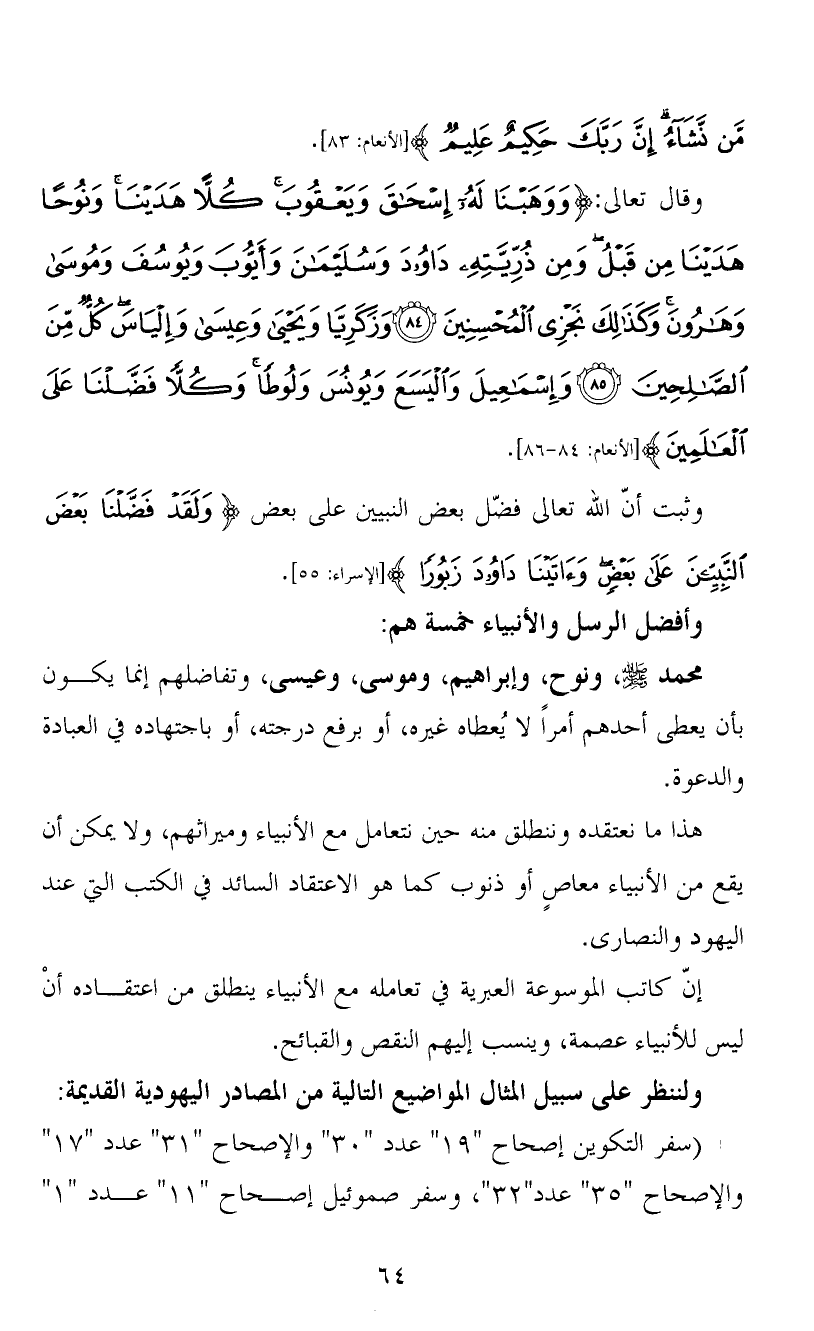 وقال تعالى: {وَوَهَبْنَا لَهُ إِسْحَقَ وَيَعْقُوبَ كُلاًّ هَدَيْنَا وَنُوحًا هَدَيْنَا مِن قَبْلُ وَمِن ذُرِّيَّتِهِ دَاوُودَ وَسُلَيْمَانَ وَأَيُّوبَ وَيُوسُفَ وَمُوسَى وَهَارُونَ وَكَذَلِكَ نَجْزِي الْمُحْسِنِينَ، وَزَكَرِيَّا وَيَحْيَى وَعِيسَى وَإِلْيَاسَ كُلٌّ مِّنَ الصَّالِحِينَ، وَإِسْمَاعِيلَ وَالْيَسَعَ وَيُونُسَ وَلُوطًا وَكُلاًّ فضَّلْنَا عَلَى الْعَالَمِينَ} [الأنعام: 84-86] .