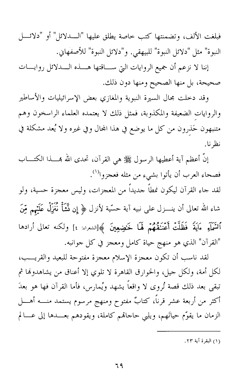 لقد ناسب أن تكون معجزة الإسلام معجزة مفتوحة للبعيد والقريب، لكل أمة، ولكل جيل، والخوارق القاهرة لا تلوي إلا أعناق من يشاهدونها ثم تبقى بعد ذلك قصة تُروى لا واقعاً يشهد ويُمارس، فأما القرآن فها هو بعدَ أكثر من أربعة عشر قرناً، كتابٌ مفتوح ومنهج مرسوم يستمد منه أهل الزمان ما يقوّم حياتَهم، ويلبي حاجاتهم كاملة، ويقودهم بعدها إلى عالم