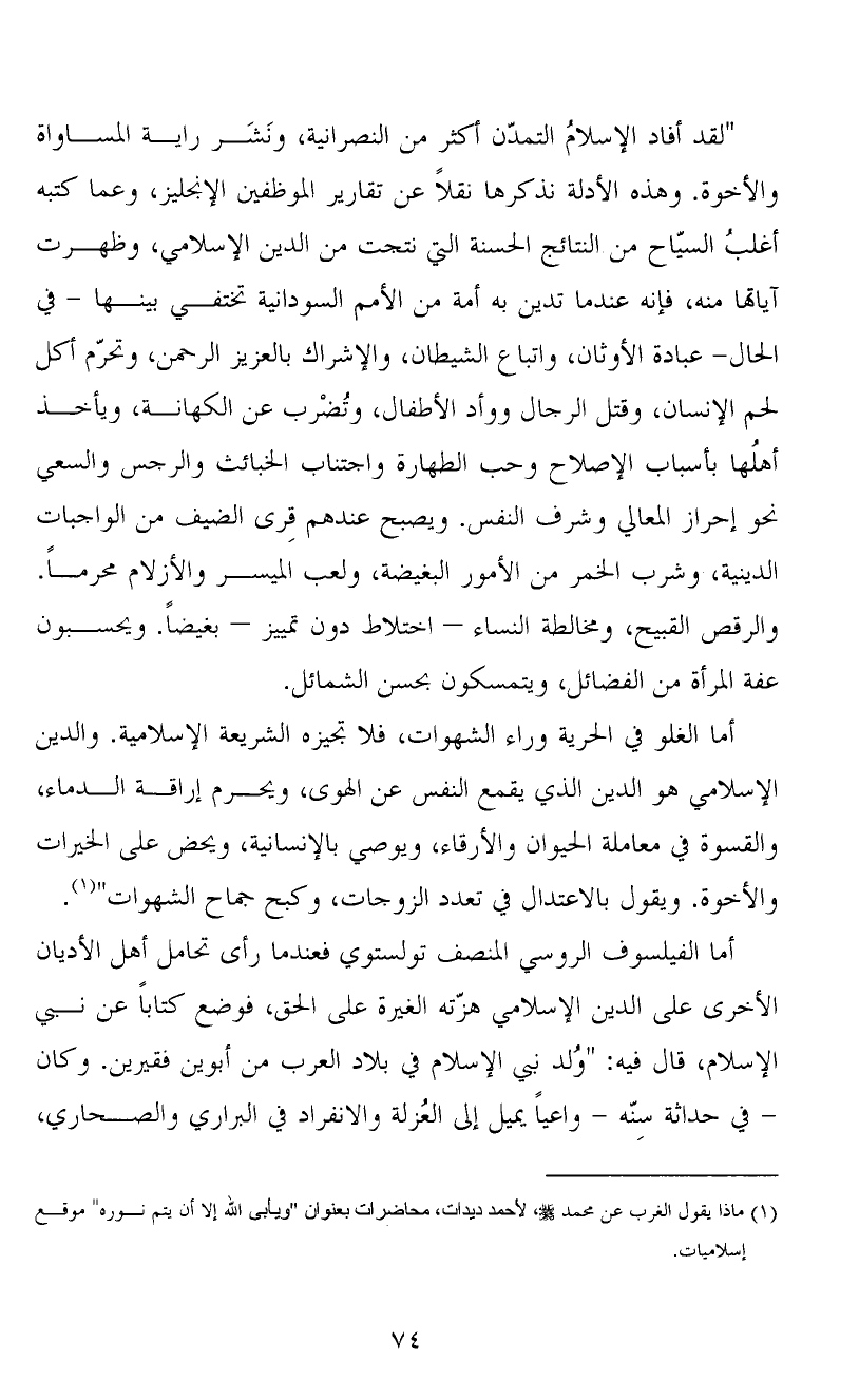 "لقد أفاد الإسلامُ التمدّن أكثر من النصرانية، ونَشَر راية المساواة والأخوة. وهذه الأدلة نذكرها نقلاً عن تقارير الموظفين الإنجليز، وعما كتبه أغلبُ السيّاح من النتائج الحسنة التي نتجت من الدين الإسلامي، وظهرت آياتها منه، فإنه عندما تدين به أمة من الأمم السودانية تختفي بينها - في الحال- عبادة الأوثان، وإتباع الشيطان، والإشراك بالعزيز الرحمن، وتحرّم أكل لحم الإنسان، وقتل الرجال ووأد الأطفال، وتُضْرب عن الكهانة، ويأخذ أهلُها بأسباب الإصلاح وحب الطهارة واجتناب الخبائث والرجس والسعي نحو إحراز المعالي وشرف النفس. ويصبح عندهم قِرى الضيف من الواجبات الدينية، وشرب الخمر من الأمور البغيضة، ولعب الميسر والأزلام محرماً. والرقص القبيح، ومخالطة النساء – اختلاط دون تمييز – بغيضاً. ويحسبون عفة المرأة من الفضائل، ويتمسكون بحسن الشمائل.