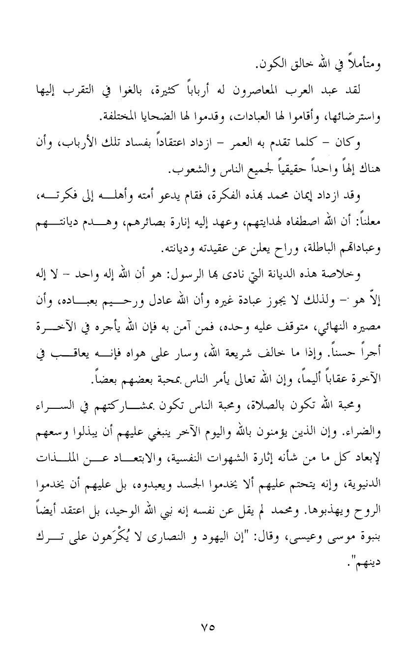 ومحبة الله تكون بالصلاة، ومحبة الناس تكون بمشاركتهم في السراء والضراء. وإن الذين يؤمنون بالله واليوم الآخر ينبغي عليهم أن يبذلوا وسعهم لإبعاد كل ما من شأنه إثارة الشهوات النفسية، والابتعاد عن الملذات الدنيوية، وإنه يتحتم عليهم ألا يخدموا الجسد ويعبدوه، بل عليهم أن يخدموا الروح ويهذبوها. ومحمد لم يقل عن نفسه إنه نبي الله الوحيد، بل اعتقد أيضاً بنبوة موسى وعيسى، وقال: "إن اليهود والنصارى لا يُكْرَهون على ترك دينهم".