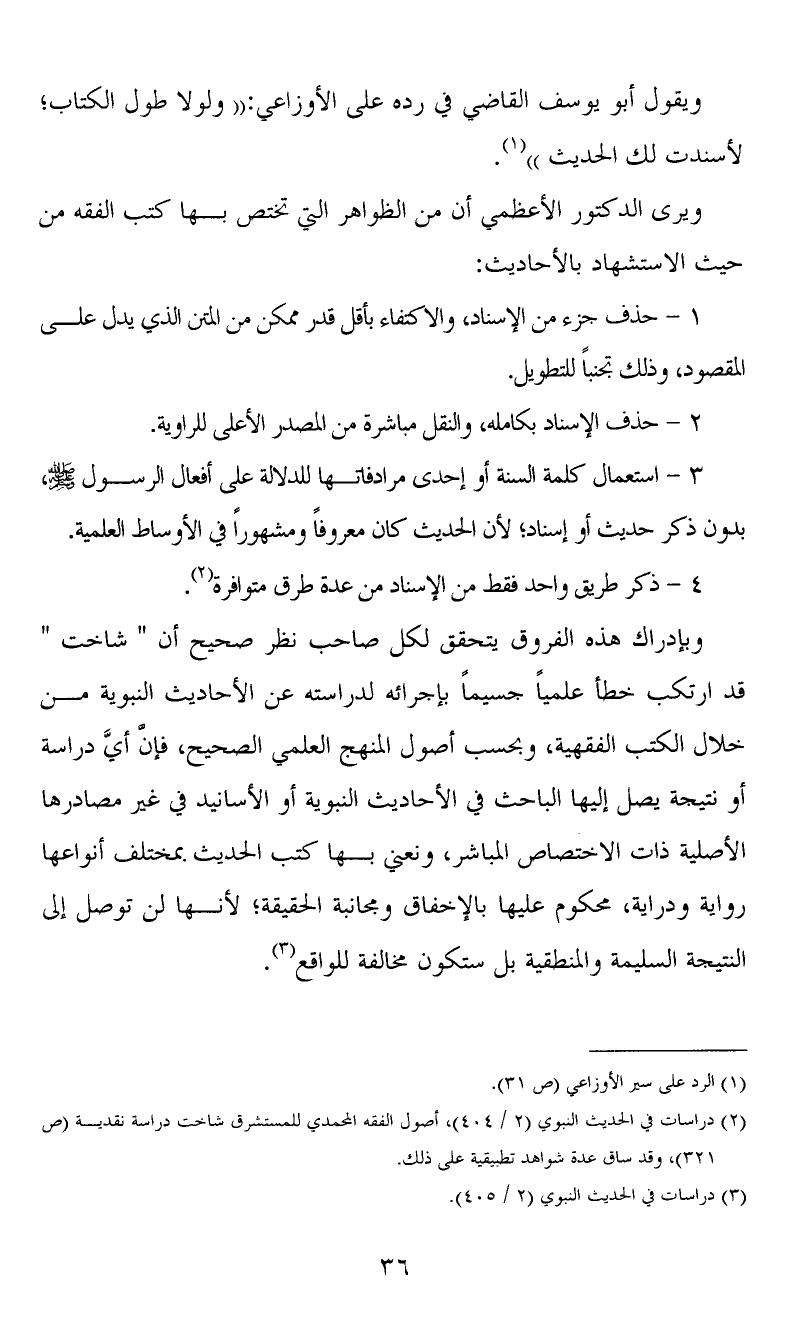 وبإدراك هذه الفروق يتحقق لكل صاحب نظر صحيح أن " شاخت " قد ارتكب خطأ علمياً جسيماً بإجرائه لدراسته عن الأحاديث النبوية من خلال الكتب الفقهية، وبحسب أصول المنهج العلمي الصحيح، فإنَّ أيَّ دراسة أو نتيجة يصل إليها الباحث في الأحاديث النبوية أو الأسانيد في غير مصادرها الأصلية ذات الاختصاص المباشر، ونعني بها كتب الحديث بمختلف أنواعها رواية ودراية، محكوم عليها بالإخفاق ومجانبة الحقيقة؛ لأنها لن توصل إلى النتيجة السليمة والمنطقية بل ستكون مخالفة للواقع (3) .