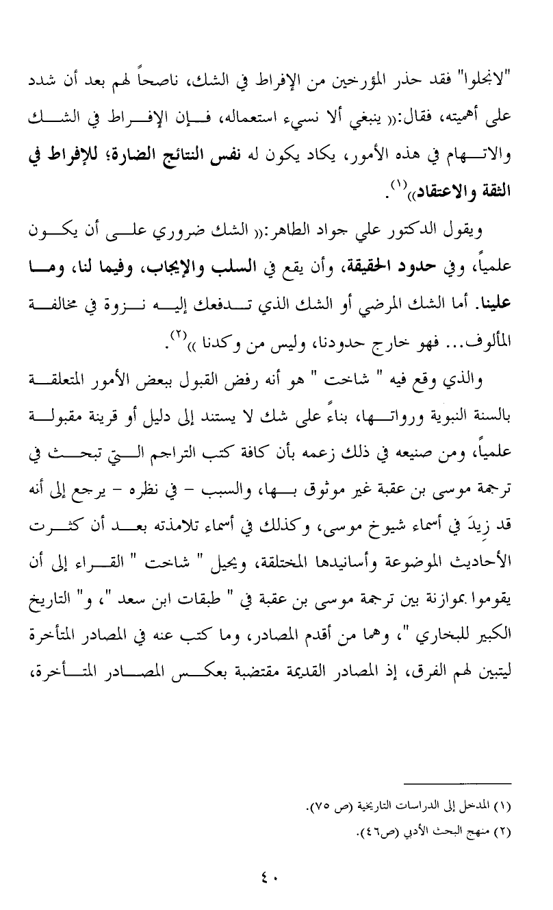 ويقول الدكتور علي جواد الطاهر: ((الشك ضروري على أن يكون علمياً، وفي حدود الحقيقة، وأن يقع في السلب والإيجاب، وفيما لنا، وما علينا. أما الشك المرضي أو الشك الذي تدفعك إليه نزوة في مخالفة المألوف ... فهو خارج حدودنا، وليس من وكدنا)) (2) .
