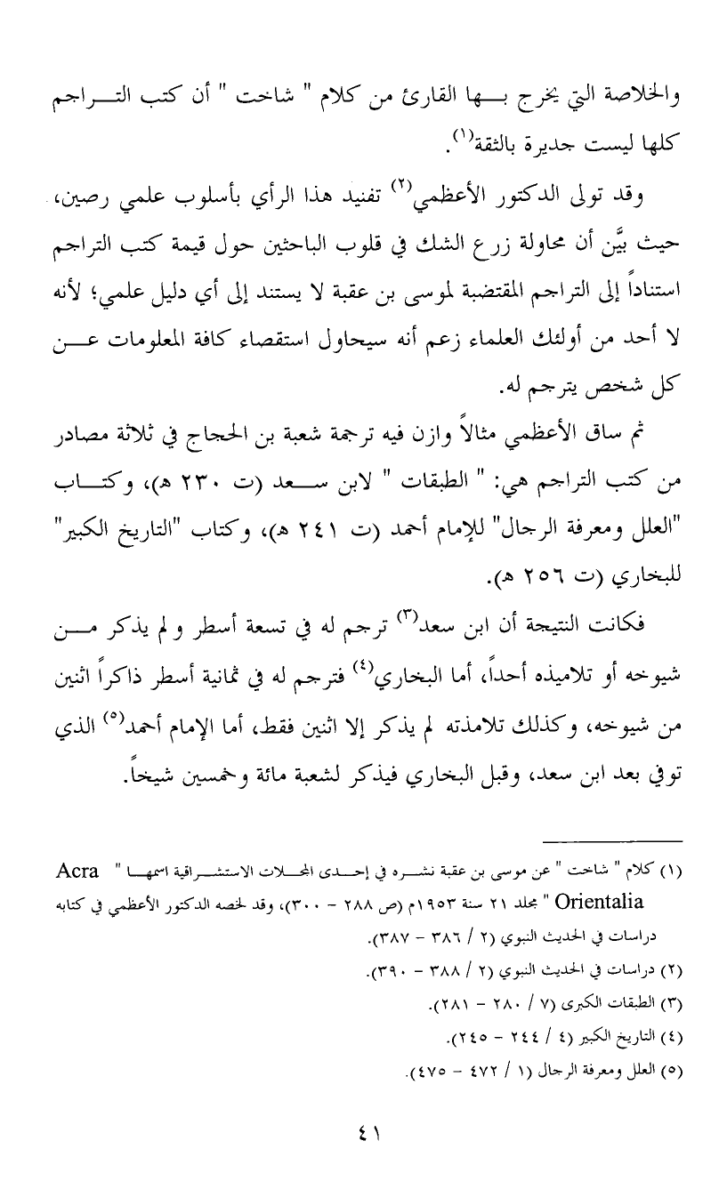 (1) كلام " شاخت " عن موسى بن عقبة نشره في إحدى المجلات الاستشراقية اسمها "Acra Orientalia" مجلد 21 سنة 1953م (ص 288 - 300) ، وقد لخصه الدكتور الأعظمي في كتابه دراسات في الحديث النبوي (2 / 386 - 387) .