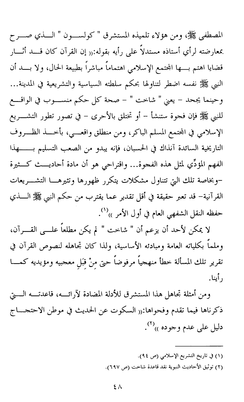المصطفى صلى الله عليه وسلم، ومن هؤلاء تلميذه المستشرق " كولسون " الذي صرح بمعارضته لرأي أستاذه مستدلاً على رأيه بقوله: ((إن القرآن كان قد أثار قضايا اهتم بها المجتمع الإسلامي اهتماماً مباشراً بطبيعة الحال، ولا بد أن النبي صلى الله عليه وسلم نفسه اضطر لتناولها بحكم سلطته السياسية والتشريعية في المدينة ... وحينما يجحد - يعني " شاخت " - صحة كل حكم منسوب في الواقع للنبي صلى الله عليه وسلم فإن فجوة ستنشأ - أو تختلق بالأحرى - في تصور تطور التشريع الإسلامي في المجتمع المسلم الباكر، ومن منطلق واقعي، بأخذ الظروف التاريخية السائدة آنذاك في الحسبان، فإنه يبدو من الصعب التسليم بهذا الفهم المؤدِّي لمثل هذه الفجوة ... واقتراحي هو أن مادة أحاديث كثيرة-وبخاصة تلك التي تتناول مشكلات يتكرر ظهورها وتثيرها التشريعات القرآنية- قد تعبر حقيقة في أقل تقدير عما يقترب من حكم النبي صلى الله عليه وسلم الذي حفظه النقل الشفهي العام في أول الأمر)) (1) .