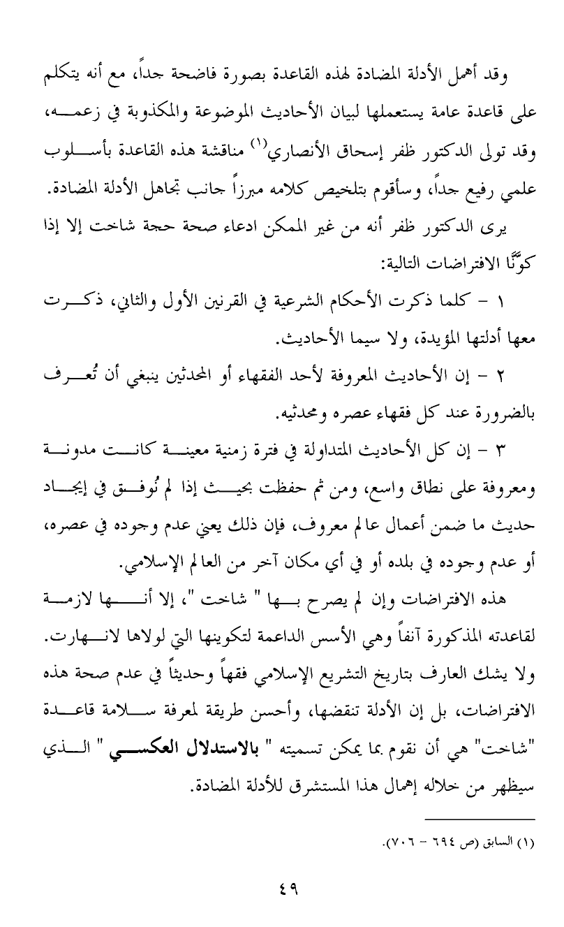 يرى الدكتور ظفر أنه من غير الممكن ادعاء صحة حجة شاخت إلا إذا كوَّنَّا الافتراضات التالية: