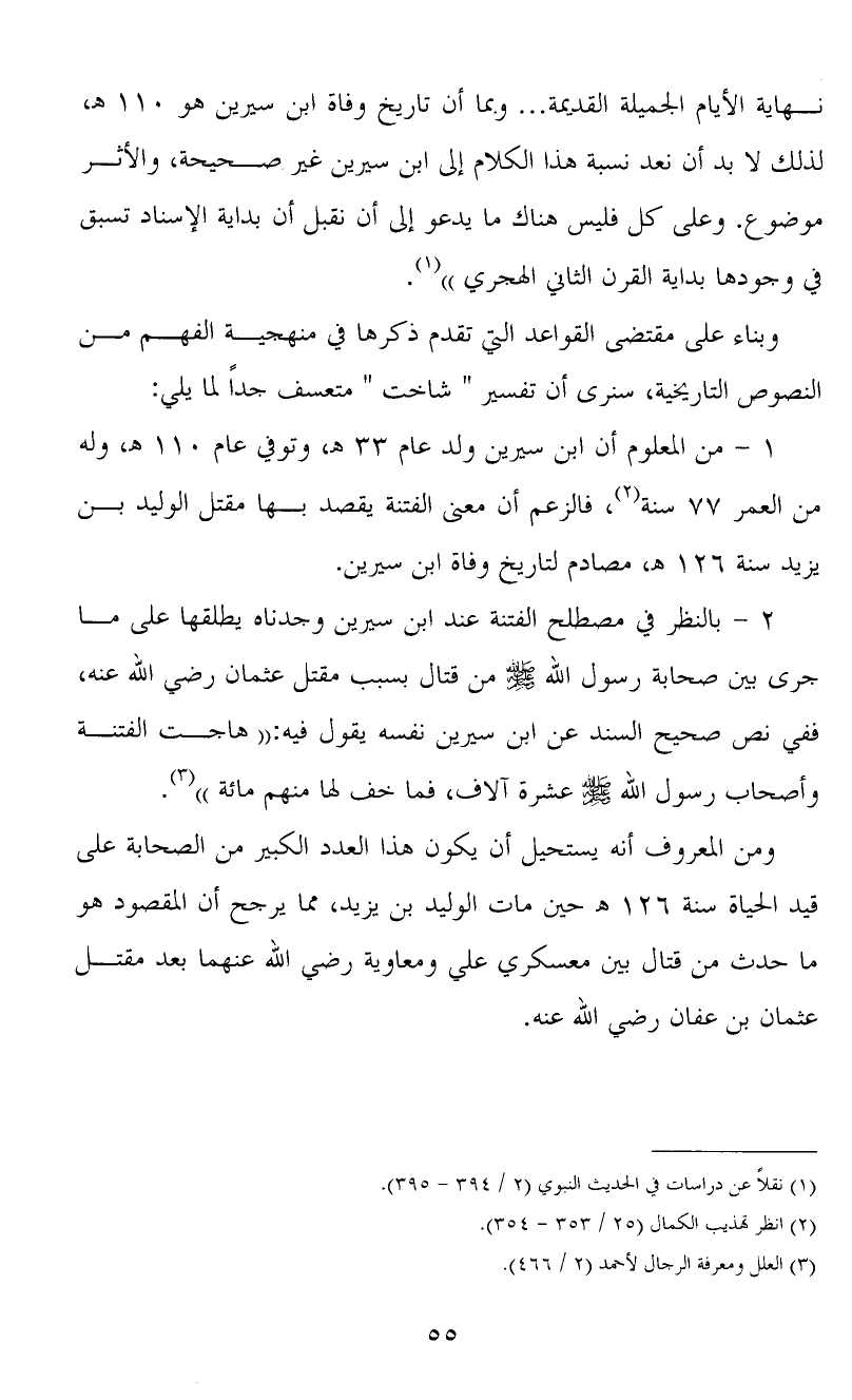 نهاية الأيام الجميلة القديمة ... وبما أن تاريخ وفاة ابن سيرين هو 110 ?، لذلك لا بد أن نعد نسبة هذا الكلام إلى ابن سيرين غير صحيحة، والأثر موضوع. وعلى كل فليس هناك ما يدعو إلى أن نقبل أن بداية الإسناد تسبق في وجودها بداية القرن الثاني الهجري)) (1) .